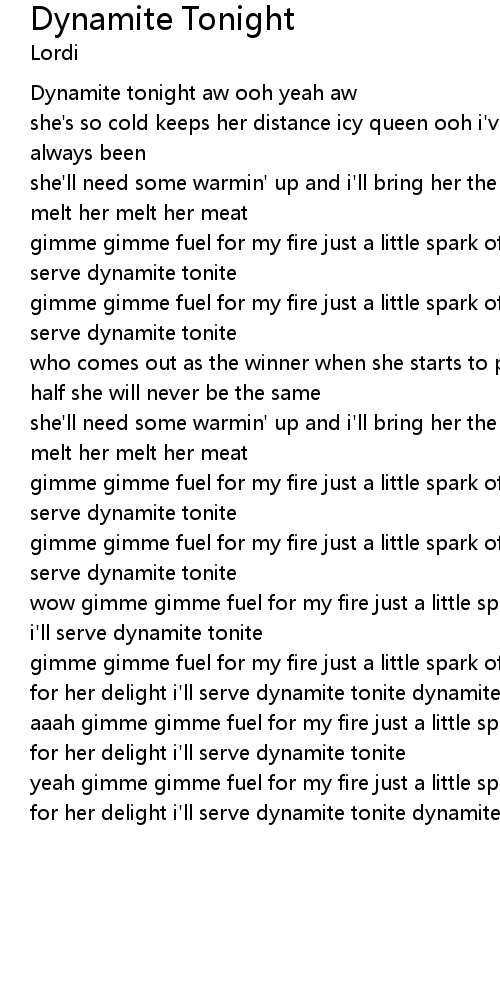 | gimme gimme fuel for my fire just a little spark of desire for her delight i'll serve dynamite tonite | |