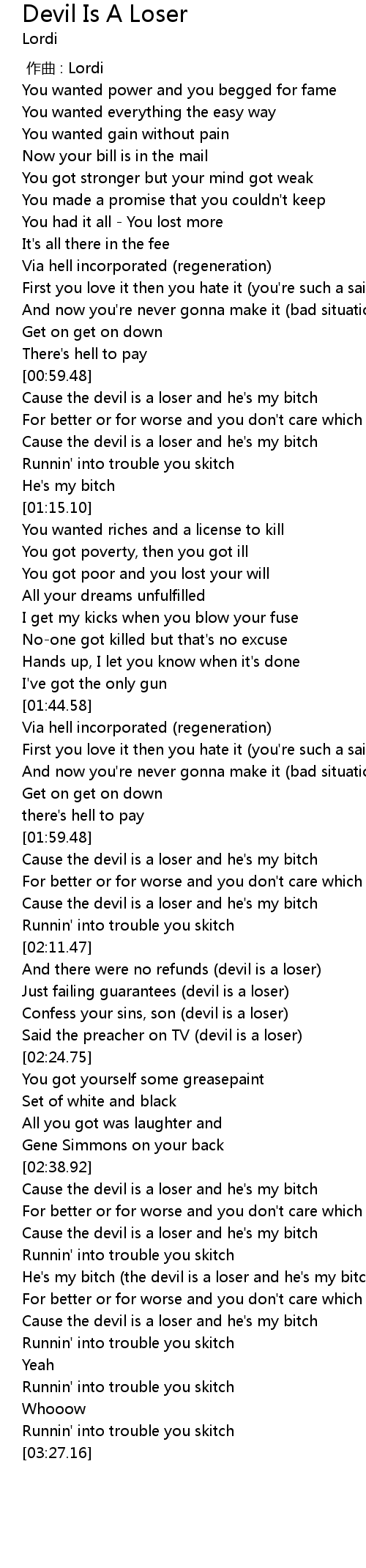 | [03:00.93] | Cause the devil is a loser and he' s my bitch |