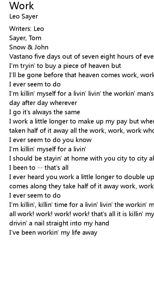 | I'm killin', killin' time for a livin' livin' the workin' man's blues yeah, it's all work! work! work! work! that's all it is killin' myself for a livin' like drivin' a nail straight into my hand | |