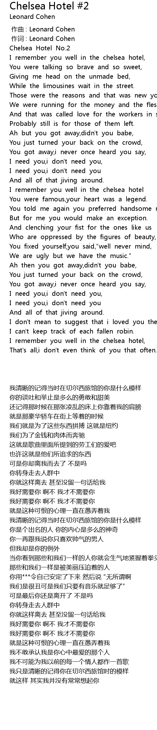 | [02:48.898] | 我只是清晰的记得你在切尔西旅馆时的模样 |