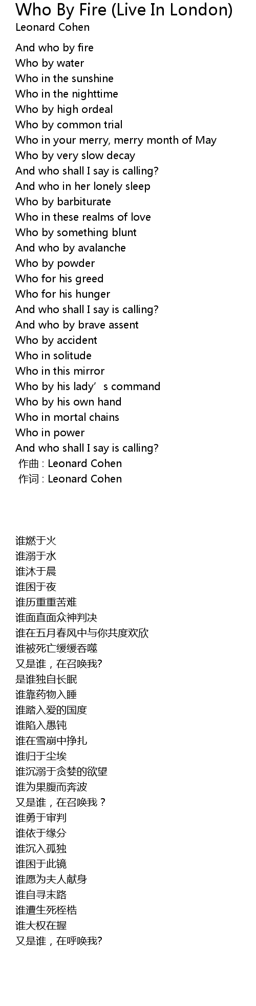 | 歌曲 | Who By Fire (Live In London) |