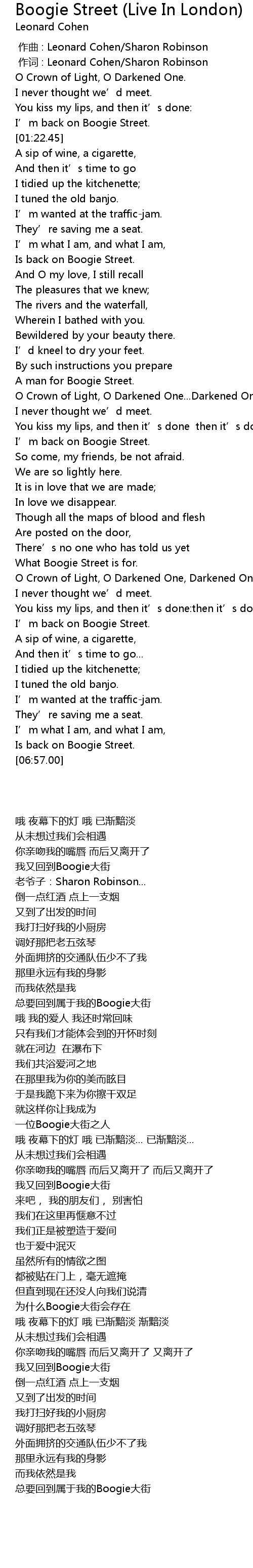 | [00:01.00] | 作词 : Leonard Cohen/Sharon Robinson |
