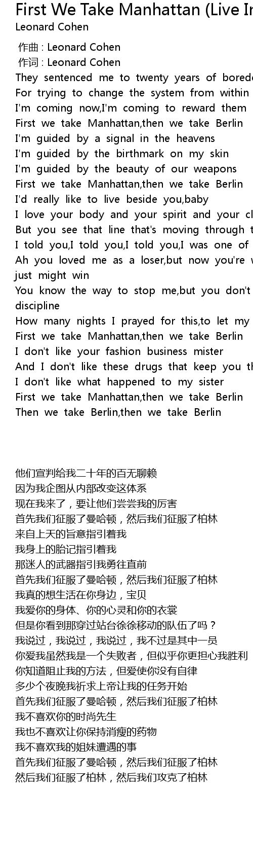 | [00:59.254] | First we take Manhattan,then we take Berlin |