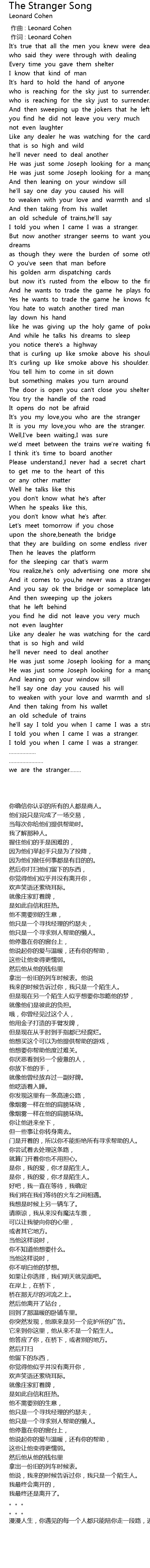| [01:19.280] | 我来的时候告诉过你,我只是一个陌生人。 |