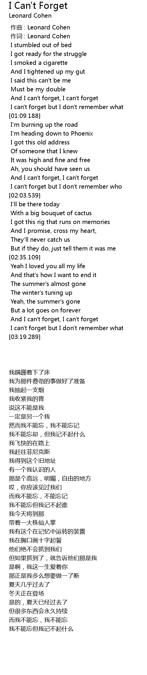 | [00:57.909] | I can' t forget but I don' t remember what |