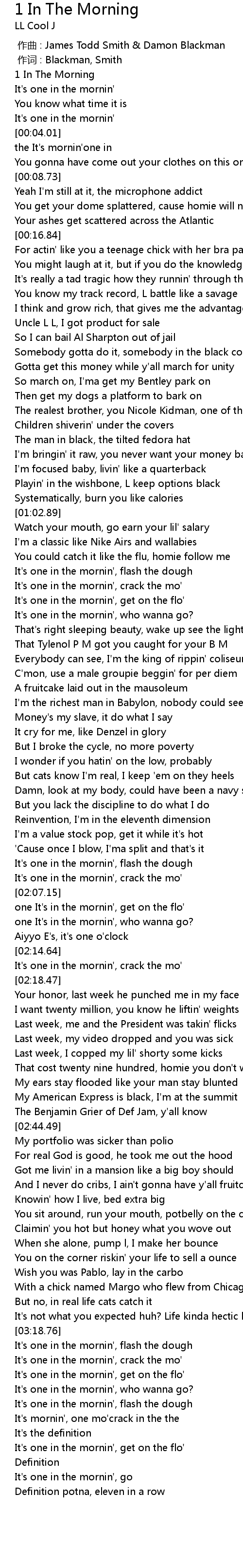 | [03:21.76] | It's one in the mornin', crack the mo' |