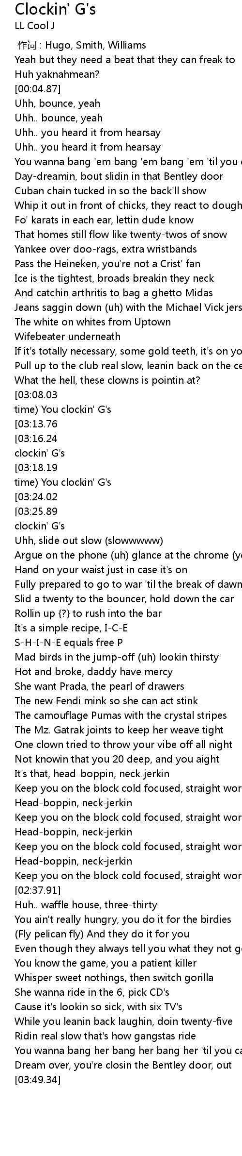 | [03:46.12][03:25.89][02:14.87][01:13.69] | (Tell homes over there to step off) You clockin' G's |