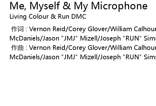 | [00:00.000] | zuo qu : Vernon Reid Corey Glover William Calhoun Darryl " DMC" McDaniels Jason " JMJ" Mizell Joseph " RUN" Simmons Douglas Wimbush |