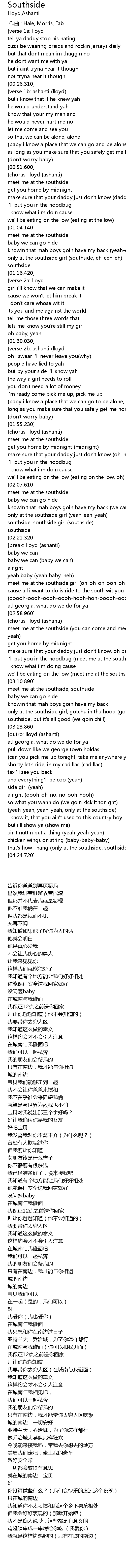 | [03:17.410] | only at the southside girl, gotchu in tha hood (got me in tha hood) |
