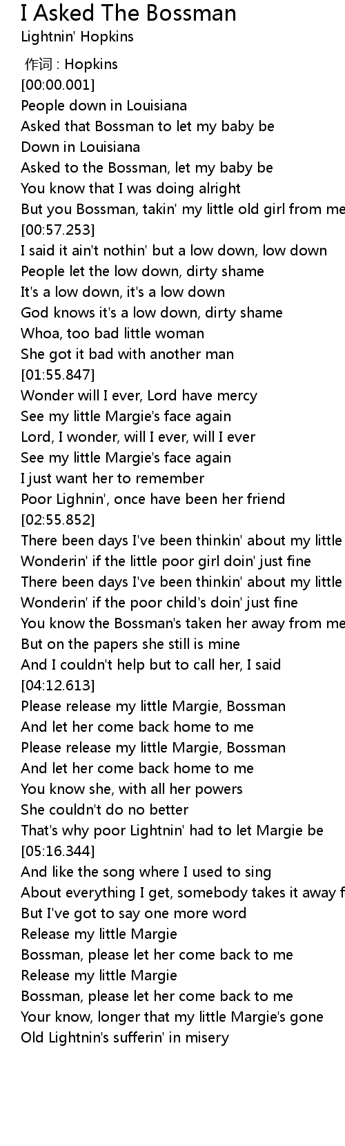 | [00:37.904] | Asked to the Bossman, let my baby be |