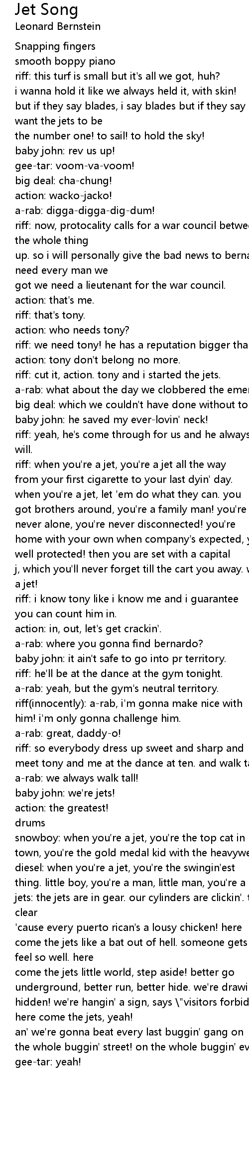 jets: the jets are in gear. our cylinders are clickin'. the sharks'll stear clear