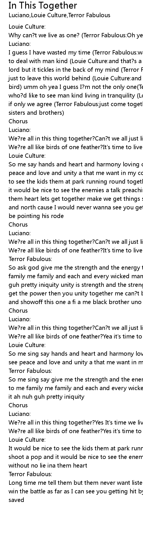 I guess I have wasted my time (Terror Fabulous:wasted my time) umm well trying to deal with man kind (Louie Culture:and that?s a very hard thing to do) oh my lord but it tickles in the back of my mind (Terror Fabulous:scratch) well well just to leave this world behind (Louie Culture:and then I would a fly like a bird) umm oh yea I guess I?m not the only one(Terror Fabulous:not the only one) who?d like to see man kind living in tranquility (Louie Culture:U.N.I.T.Y) and if only we agree (Terror Fabulous:just come together) we can live in unity (like sisters and brothers) |