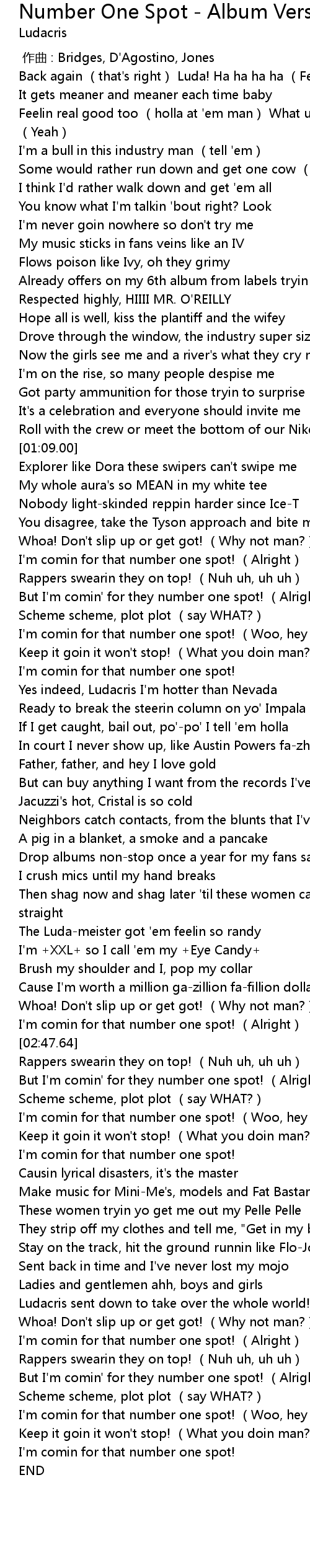 | [02:44.64] | I'm comin for that number one spot! (Alright) |