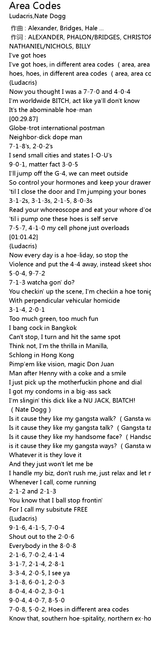 | [00:15.18] | hoes, hoes, in different area codes (area, area codes..codes) |