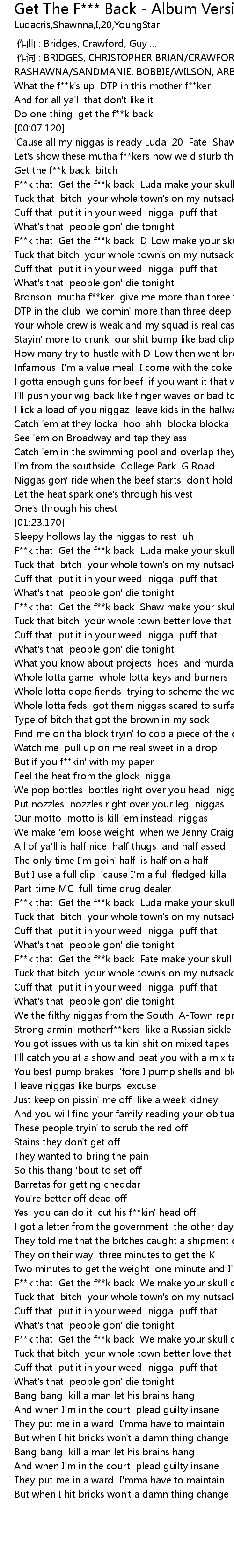 | [00:18.590] | F**k that Get the f**k back Luda make your skull crack |