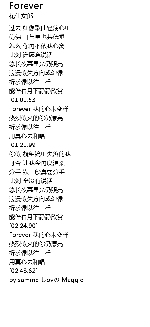 | [01:03.00] | Forever wǒ de xīn wèi biàn yàng |