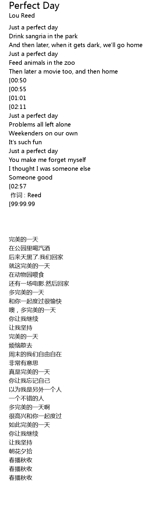 | [01:57][00:50] | Oh it' s such a perfect day |