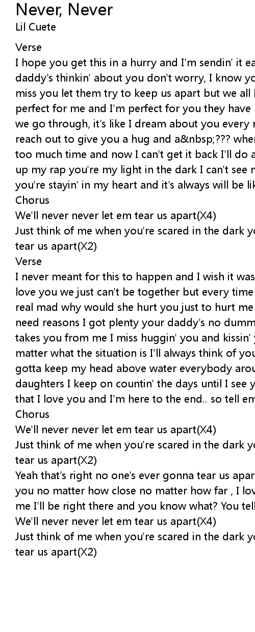 Just think of me when you're scared in the dark you know ain't no one's gonna tear us apart(X2) |