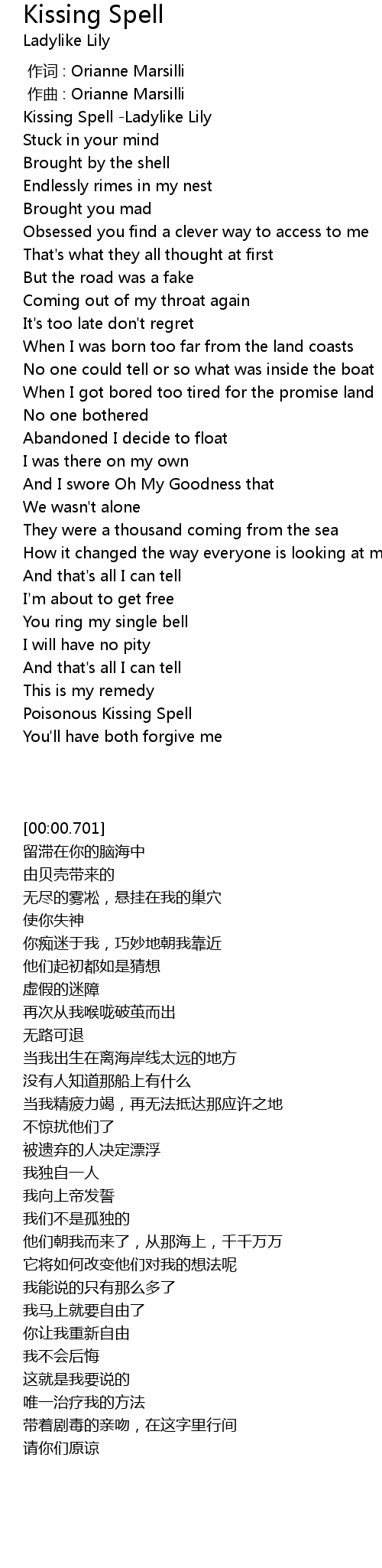 | [00:00.701] | Kissing Spell -Ladylike Lily |