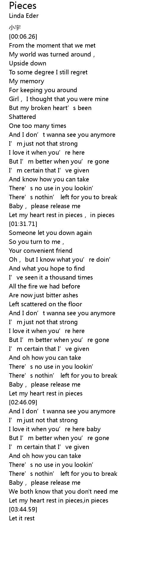 | [03:28.40] | Let my heart rest in pieces, in pieces |