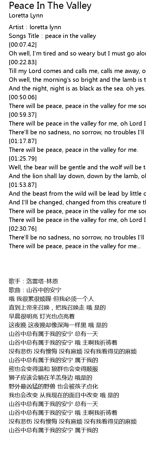 | [00:05.03] | Songs Title: peace in the valley |