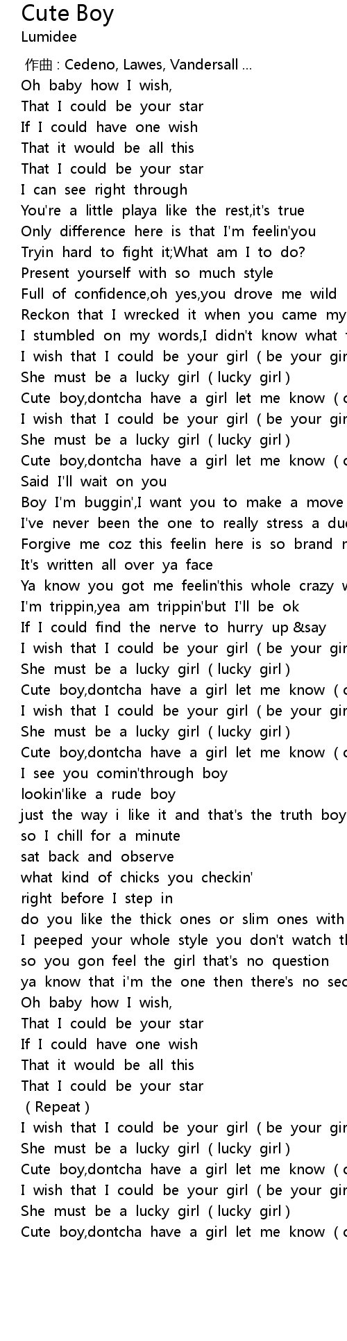 | [01:40.386] | Cute boy, dontcha have a girl let me know cute boy |