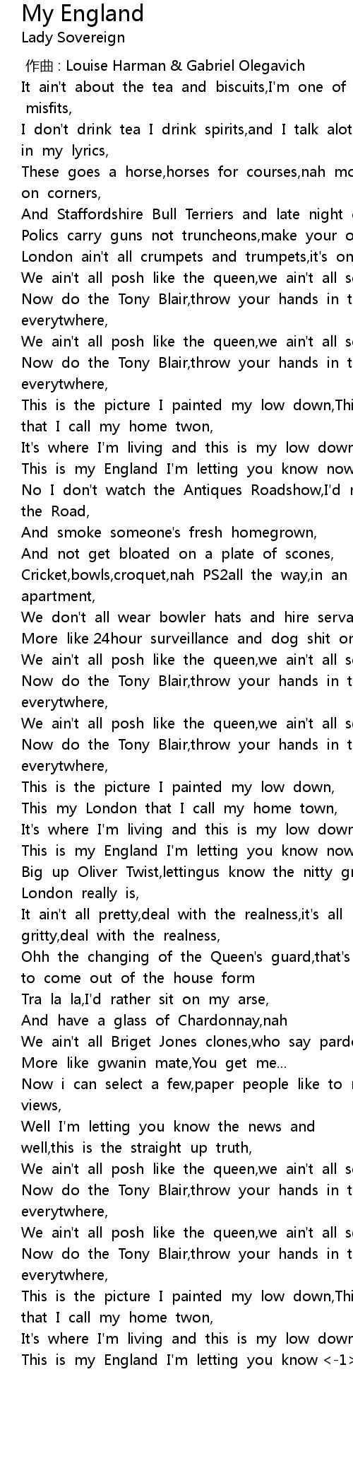 | [00:59.71] | This is my England I' m letting you know now, |