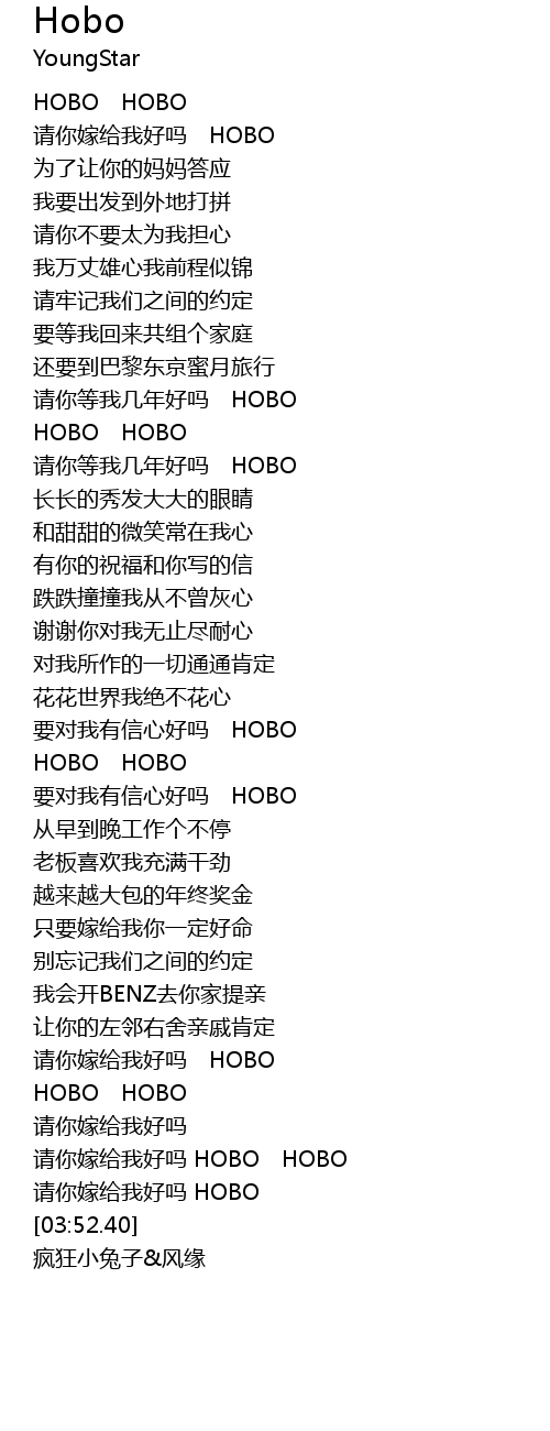 | [02:57.64] | 请你嫁给我好吗 HOBO HOBO |