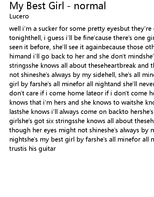 | well i'm a sucker for some pretty eyesbut they're going home with some other boy tonighthell, i guess i'll be fine'cause there's one girl whose all mineshe's seen it before, she'll see it againbecause those other girls going home with himand i'll go back to her and she don't mindshe's my best girlshe's got six stringsshe knows all about theseheartbreak and thingsand though her eyes might not shineshe's always by my sidehell, she's all minefor all nightshe's my best girl by farshe's all minefor all nightand she'll never break my heartwell she don't care if i come home lateor if i don't come home for seven long nightsshe knows that i'm hers and she knows to waitshe knows those other girls just won't lastshe knows i'll always come on backto hershe's all that i've gotshe's my best girlshe's got six stringsshe knows all about theseheartbreak and thingsand though her eyes might not shineshe's always by my sideshe's all minefor all nightshe's my best girl by farshe's all minefor all nightthe only girl a boy can trustis his guitar |