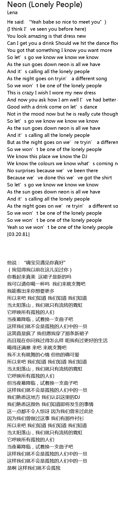 | [03:13.49] | Yeah so we won' t be one of the lonely people |
