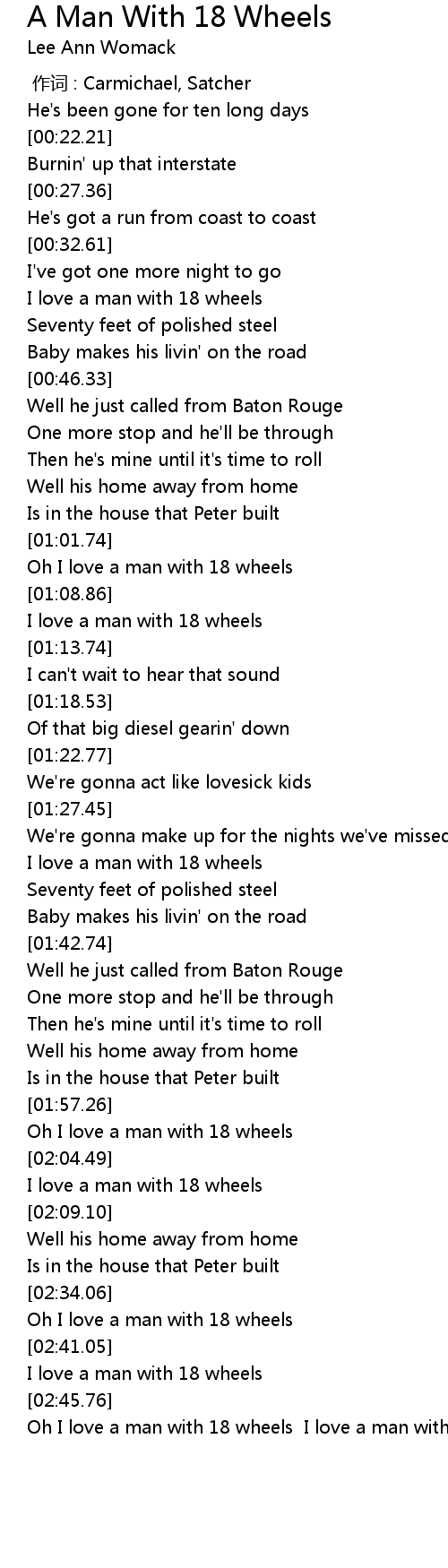 | [02:46.88] | Oh I love a man with 18 wheels I love a man with 18 wheels |
