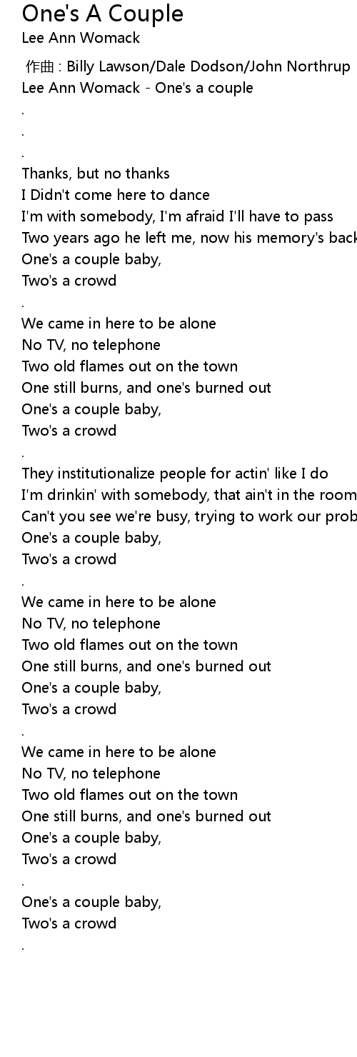 | [00:00.12] | Lee Ann Womack - One's a couple |
