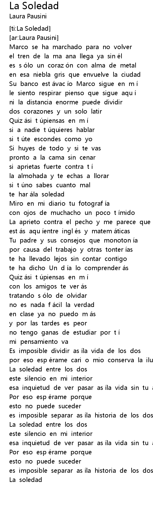 | [00:30.74] | Su banco est a vac i o Marco sigue en m i |