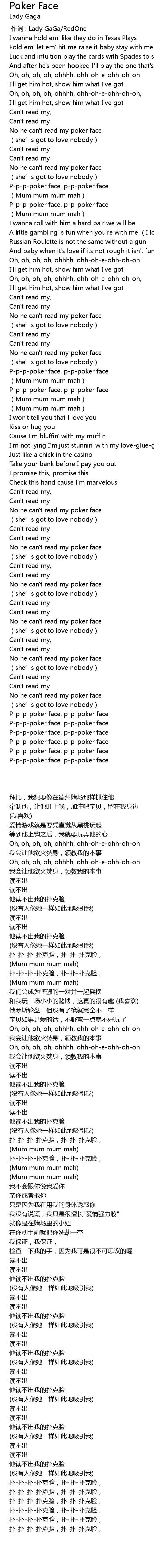 | [00:58.950] | No he can' t read my poker face |