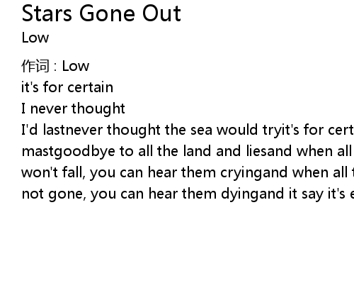 | I' d lastnever thought the sea would tryit' s for certainyou can tie me to the mastgoodbye to all the land and liesand when all the stars have gone outthey won' t fall, you can hear them cryingand when all the stars have gone outthey' re not gone, you can hear them dyingand it say it' s enough |