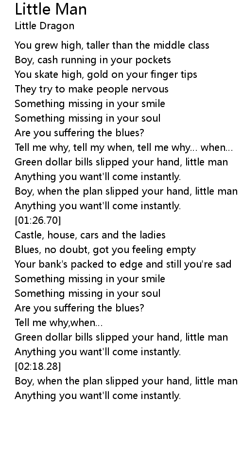 | [01:11.43] | Green dollar bills slipped your hand, little man |