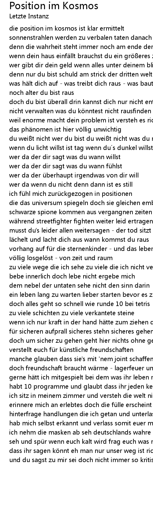 | was hält dich auf - was treibt dich raus - was baut dich auf - was willst du noch alter du bist raus | |