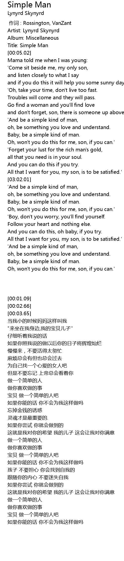 | [00:03.65] | Title: Simple Man |