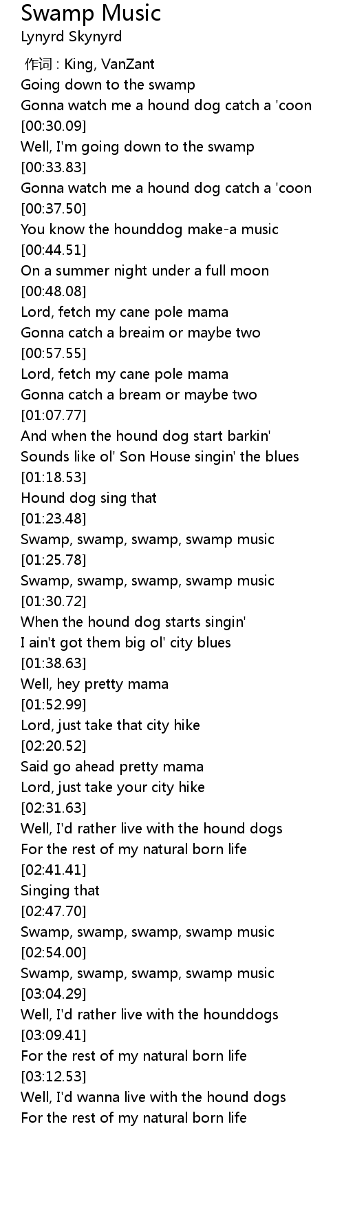 | [03:01.59] | Swamp, swamp, swamp, swamp music |