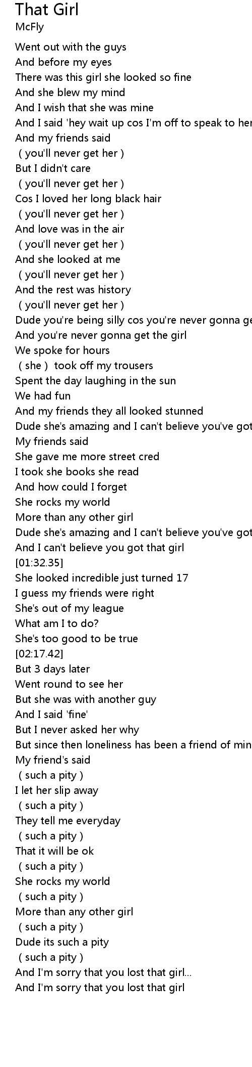 | [03:04.23] | And I' m sorry that you lost that girl |