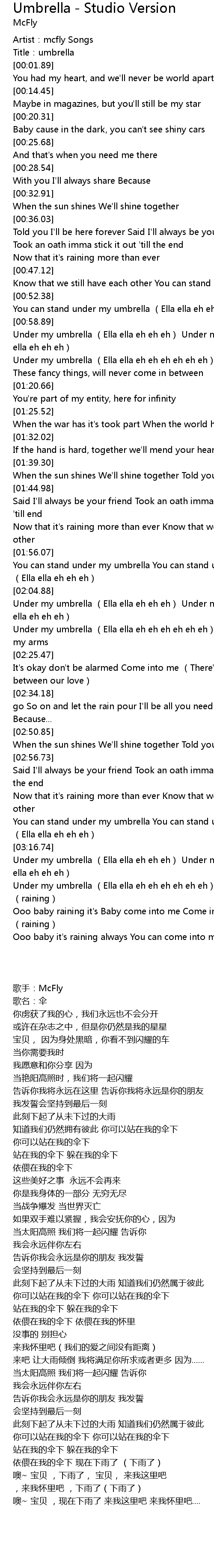 | [03:17.31] | Under my umbrella Ella ella eh eh eh Under my umbrella Ella ella eh eh eh |