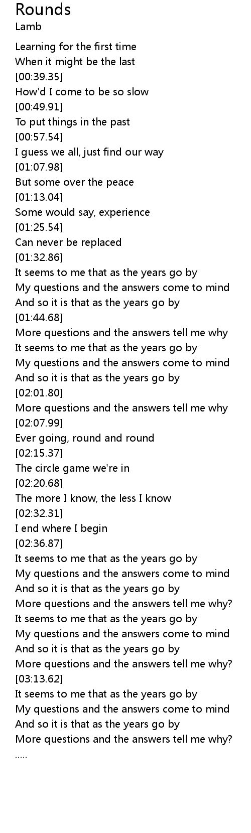 | [01:46.06] | More questions and the answers tell me why |