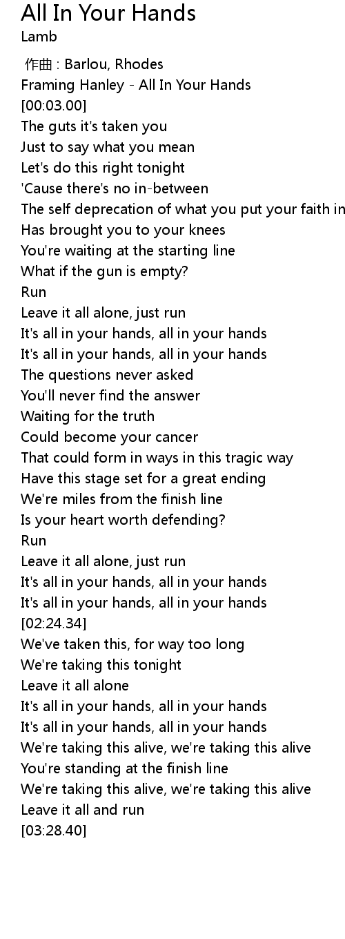 | [00:01.00] | Framing Hanley All In Your Hands |
