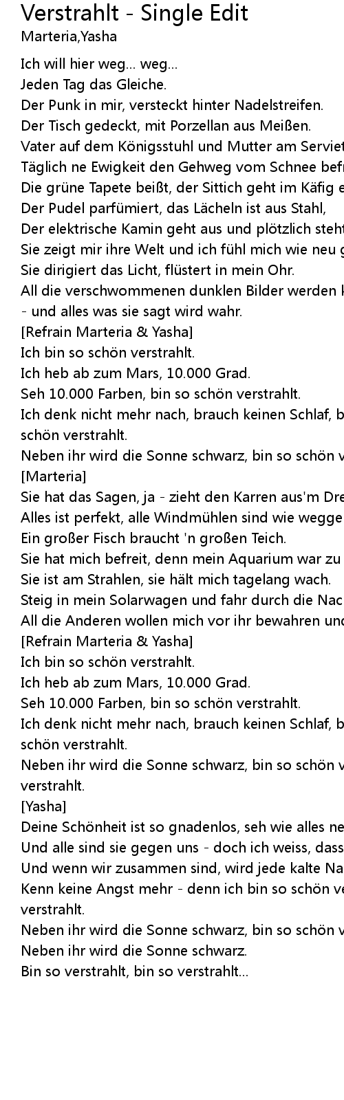 | Neben ihr wird die Sonne schwarz, bin so schön verstrahlt, bin so schön verstrahlt. | |