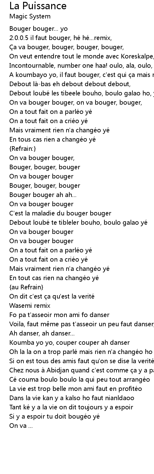 | A koumbayo yo, il faut bouger, c'est qui ça mais maintenant tu fais quoi | |