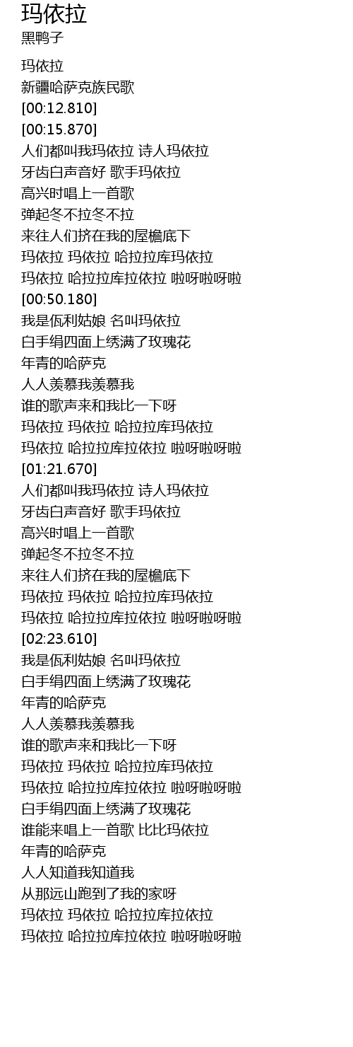 | [00:20.670] | 人们都叫我玛依拉 诗人玛依拉 |