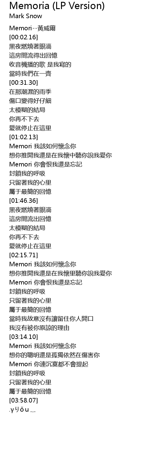 | [02:31.52] | Memori nǐ huì hèn wǒ hái shì wàng jì |