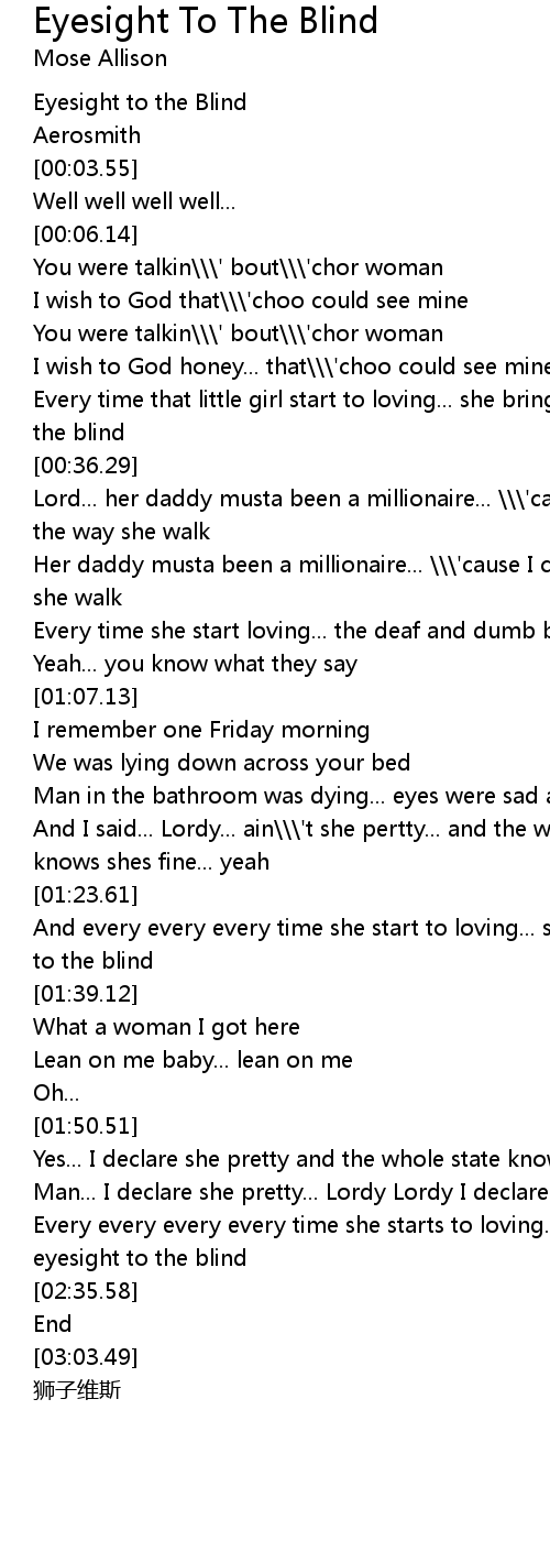 | [00:29.65] | Every time that little girl start to loving... she bring eyesight to the blind |