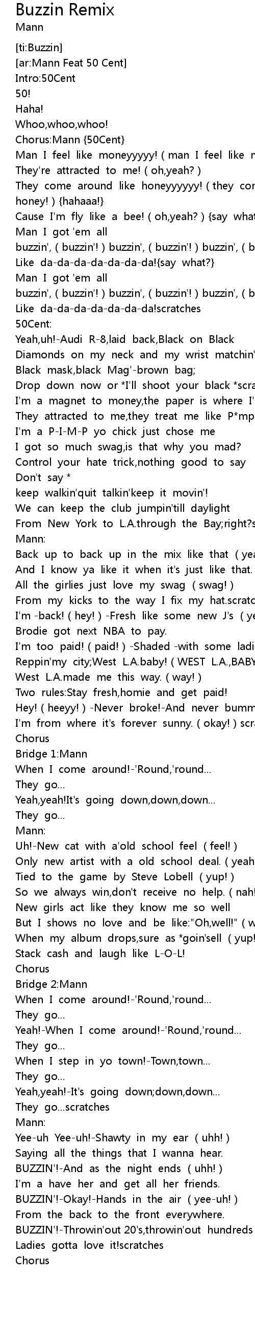 | [00:25.371] | Man I got 'em all buzzin',(buzzin'!)buzzin',(buzzin'!)buzzin',(buzzin'!)buzzin', |