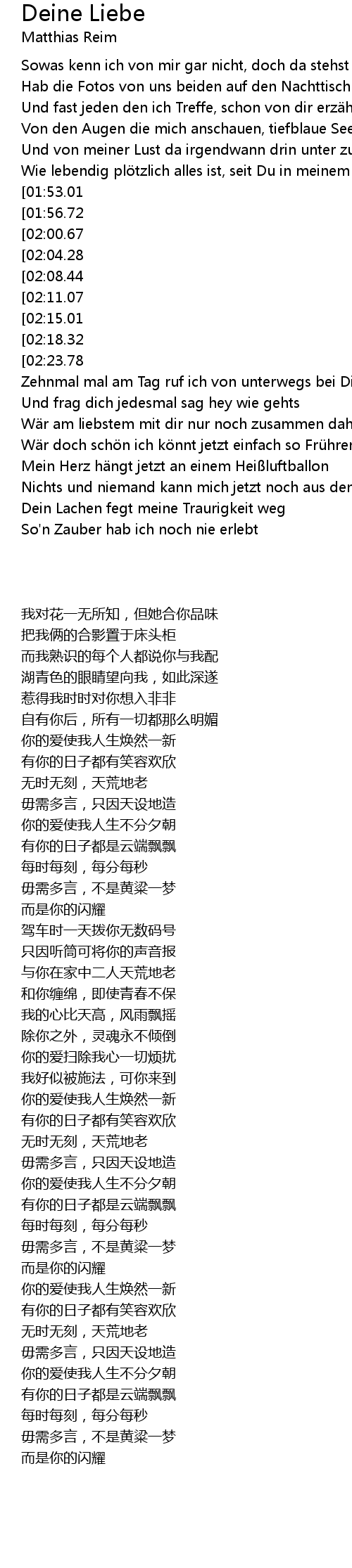 | [00:43.31][01:53.01][02:31.68] | Deine Liebe macht mein Leben neu |